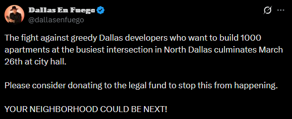 Here is the other problem with the greedy argument. I don't think the people saying it actually believe it. I do not think an organized bloc of Dallas homeowners recently became Marxists and now believe the state should seize the means of housing production. If the same building were proposed by a nonprofit, most of the same people would still show up to oppose it. The claim isn't really about profit at all.